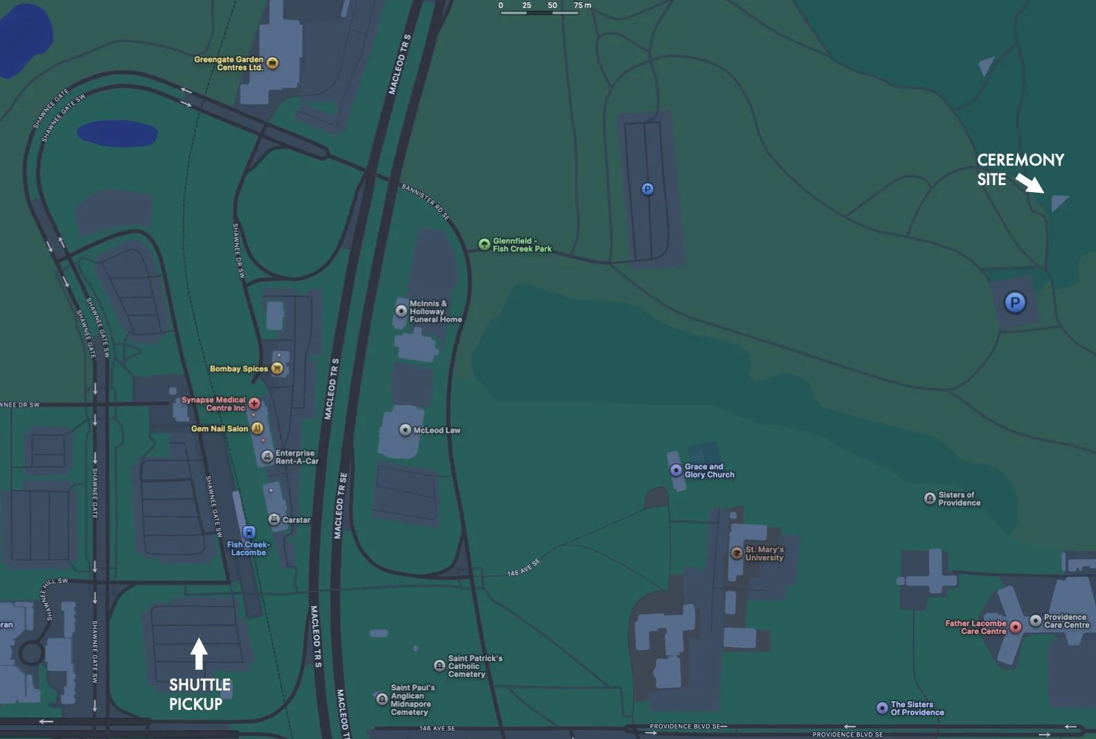 The shuttle to the reception will leave from the south parking lot at Fish Creek Lacombe C-Train Station, departing at 2:45 PM. Please make sure to move your vehicles to that lot as the ceremony’s parking lot will be closed at 8PM.